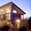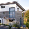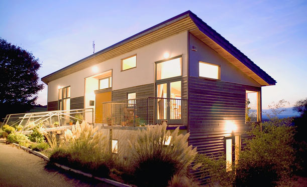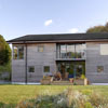 This new house has been designed to sit into the hillside setting, which allows maximising of the views at the upper level where the livingrooms are located. An elevated bridge brings you from the driveway into the house. The bedrooms are located at the lower, garden level. The house was built in the American ‘balloon’ timber frame style. External finishes are a mix of lightweight render and lightweight cedar timber cladding.