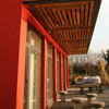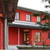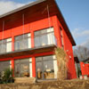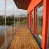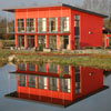 A site with a stunning setting beside a man-made lake. A light-filled house to connect with the landscape. This new house was designed to make the most of its setting, and to maximise solar gain for the purpose of heating the house. The entire south elevation is glazed, and provided with solar shading (summer) by the overhanging roof. This cantilevered roof supports the first floor balcony, which in turn provides solar shading to the ground floor. On sunny days the house requires little heating to be comfortable inside, as the solar gain combined with high levels of insulation and a heat recovery ventilation system look after much of the heating needs. The client selected a striking red colour for the house, to make it contrast sharply with the landscape setting.